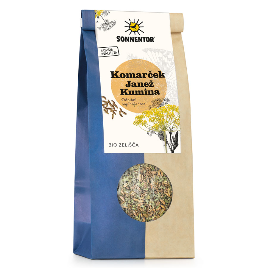 komarček 40%, janež 30%, kumina 20%, melisa; nadzorno mesto: AT-BIO-301.