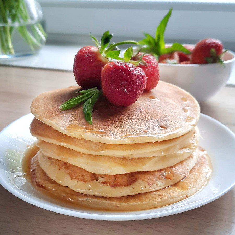 Naravno brez glutena, polnovredno in okusno. Palačinke so hitro pečene, postrežemo jih tople prelite z javorjevim sirupom in okrašene s sezonskim sadjem.