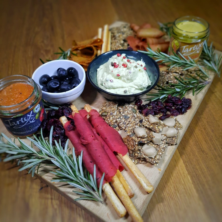 Naša plošča vsebuje rastlinske namaze, krekerje, grisine, veganske narezke, brusnice in olive.